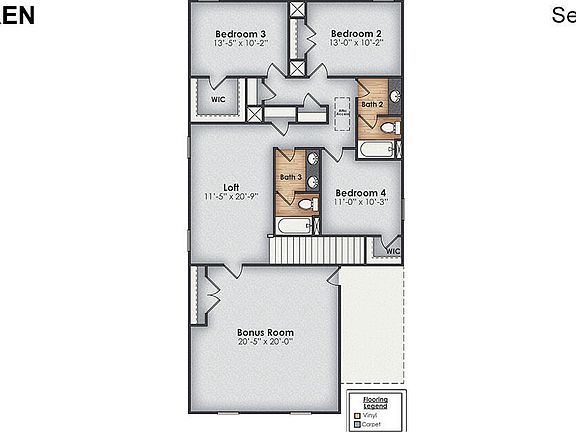 - Room types: Master Bedroom, Bedroom 2, Bedroom 3, Bedroom 4, Bonus Room, Living Room, Dining Room, Den
