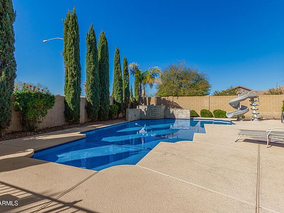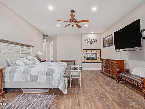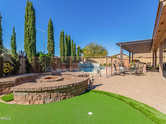 Discover the perfect home in 55+ Sunland Springs Village The exterior features stone accents, a large 3.5-car garage, a convenient RV gate, beautiful landscaping. The home has 3 beds, 2 full baths, 2 half baths, and 2 dens! Be greeted by wood-look tile floors and plantation shutters. The house boasts a spacious great room with a cozy stone-accented gas fireplace. The kitchen is a chef's dream, with white cabinets stainless steel appliances including wall ovens, a gas cook top, mosaic tile backsplash, granite counters, a walk-in pantry, and a center island with a breakfast bar. The main bedroom is a private retreat,with backyard access, a two-way gas fireplace and exquisite walk in shower. Enjoy the expansive backyard under the extended covered patio. The backyard features a firepit, paver seating areas, a private putting green, and a fenced-in play pool. A versatile den can serve as an office or studio. The garage includes attached cabinets for extra storage. This home is a true gem, offering everything you need for a comfortable and luxurious lifestyle. Experience it for yourself!
