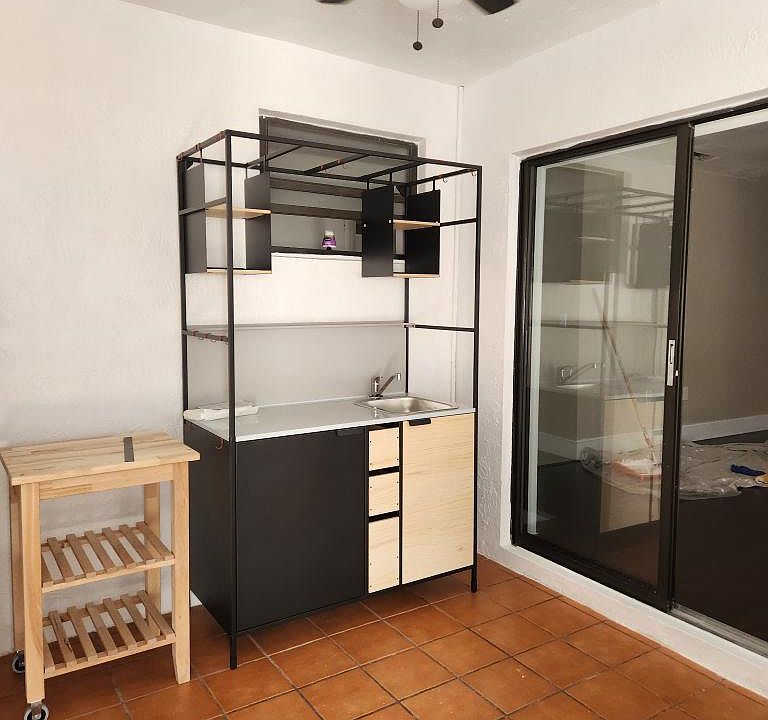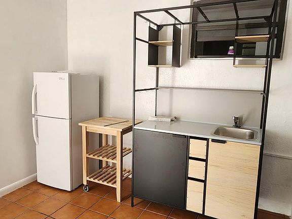 A cozy leaving space featuring a bedroom, bathroom, walk-in closet, and kitchenette. Enjoy your own private entrance and parking. Water and electricity is included in rent. Water, gas and electrical is included in rent. First month, last month and security deposit is required.