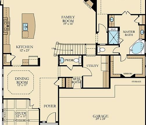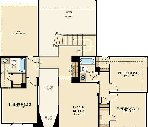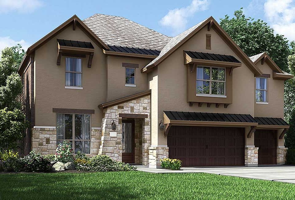 The stunning two-story Brittany plan by Village Builders features a study with the option to add beautiful exposed ceiling beams, formal dining room, family room with corner fireplace, island kitchen with breakfast nook, and a covered rear patio with the option to add an outdoor grilling area. The first floor master bedroom and bath feature dual sinks, separate shower and corner tub, private toilet enclosure, and a spacious walk-in closet. The second floor features a large game room, three additional bedrooms, and an option to add a dedicated media room.