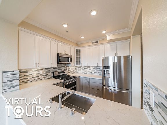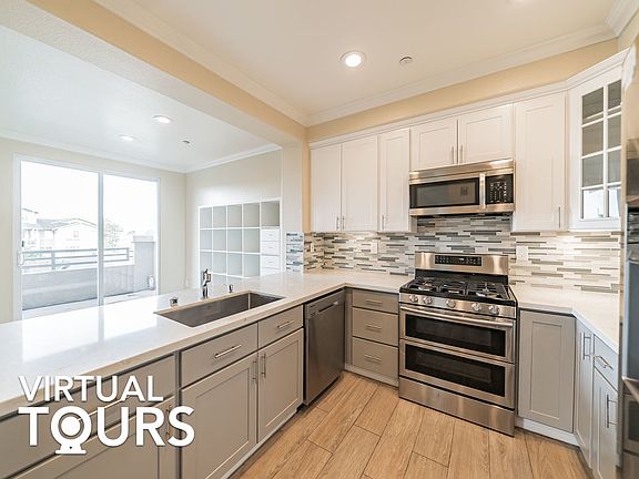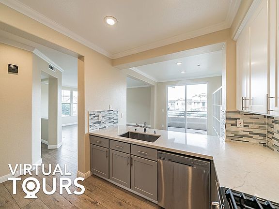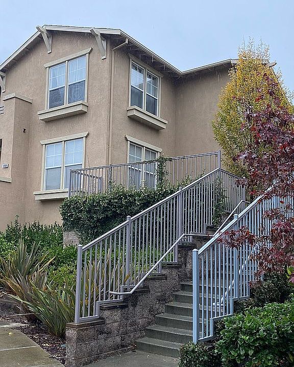 Move-in ready 3 bd / 2 ba condo with beautiful upgrades, a gourmet kitchen, and open layout! A staircase leads to the main floor, where wood laminate flooring, crown molding, and an abundance of natural light create a warm and inviting interior. Entertain in the spacious living room and gather in the adjacent dining room, complete with built-in shelving and access to the balcony through sliding glass doors. The chef in the home is sure to love the kitchen, equipped with quartz countertops, stainless steel appliances, a gas cooktop, glass tile backsplash, and gray wooden cabinets! Head down a hallway to reach the three carpeted bedrooms. The primary suite offers a walk-in closet, quartz countertop vanity, soaking tub, glass door shower, and water closet, while the two secondary bedrooms share the hallway bath, containing a quartz countertop vanity and shower/tub. Forced Air heating. In-unit laundry. Two car garage with workspace area. HOA maintained landscaping and park! Located near the Oakland Zoo, San Leandro Bay, shopping, and dining! Easy access to I-580/880, Oakland Int'l Airport, public transportation, the Bay Bridge, and all the Bay has to offer! Buyer should verify all information.