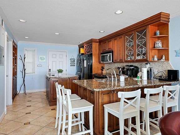 WOW! What a bargain and priced to sell! BEAUTIFUL front-facing remodeled condo with unobstructed GULF views! This 2-bedroom unit has 180 degree beach views - you can sit on your balcony and look up and down the beach. Large remodeled kitchen has been opened up to the living area & has a built-in bookcase, granite island plus a large breakfast bar, and full-size washer & dryer. Gorgeous granite counter tops are in the kitchen and both bathrooms. Primary bathroom has a jetted tub with shower; second bathroom has a very large walk-in shower. Currently used as a vacation rental, the new buyer can assume future bookings if desired. This condo is sold fully furnished including kitchenware and most of the decor - all you need are your toothbrush and bathing suit!