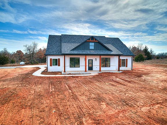 Beautiful new build in Cedar Ridge Seven, a great new subdivision that has 25 total tracts. This 5 acre tract offers lots of trees, privacy & space. Home is equipped with all new stainless steal appliances, granite countertops, tankless water heater, tile throughout, carpet in bedrooms, closets have built-ins and lights, ceiling fans in all bedrooms, spray foam insulation in walls and roof, with the exception of the garage attic, which has blown fiberglass insulation, full gutters, a 2 car garage with an automatic door opener, outside key pad, and extra storage. Inside the home, you will find a full staircase that leads to the upstairs unfinished bonus (approx 327sqft, buyer to verify livable sqft), which could be finished at an additional cost to the buyer. Easy access to Highway 76, south of Blanchard, west of Dibble & I35. Dibble schools. Outbuildings up to 30x50x12 allowed with building committee's approval. 50' front, 40' side & 30' rear setbacks. Well & Septic. Horses, cattle, sheep, goats, pigs & chickens, will be allowed. Owner may have three horses or calves per lot or have 4 sheep, pigs, goats per lot & max of 24 chickens. $250 annual road maintenance required. NO other HOA fees. PSO - electric, Pioneer - phone/internet, Mail - City of Blanchard, propane for gas. Possibly OEC for internet. Trash - buyer to choose - Grading to be completed and sod installed prior to closing.