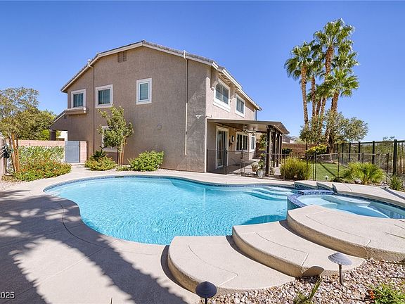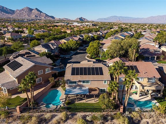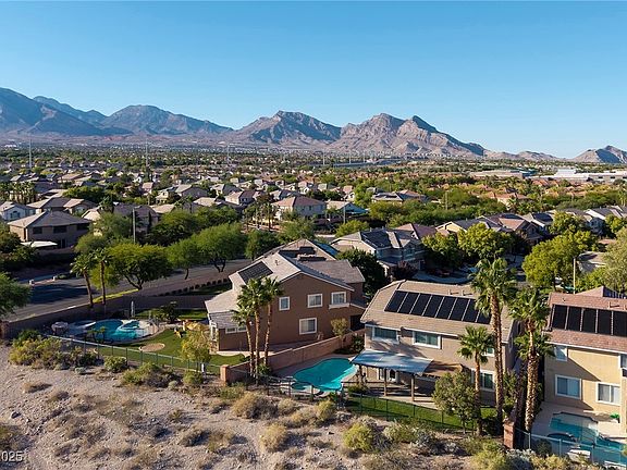 Welcome to your new home in Summerlin! This home not only sits above the walking trails that runs from Hualapai to behind Costco, it has incredible views of the strip and is perfect for the fireworks shows put on by the Red Rock Casino and the Strip. The home has energy efficient newer AC units AND Anderson windows on most of the home helping reduce your costs immensely! With 2 family rooms the whole family can watch what they want or play their favorite games in the giant family room upstairs *. The vibrant pool & spa awaits you for the hot Vegas summers. With tons of storage throughout the home and extra long shed on the side of the home you'll have lots of room to store your favorite things. 5 bedrooms, one downstairs, one bedroom upstairs is an ensuite, 4 full baths, 3 car garage + and office; you can have it all!