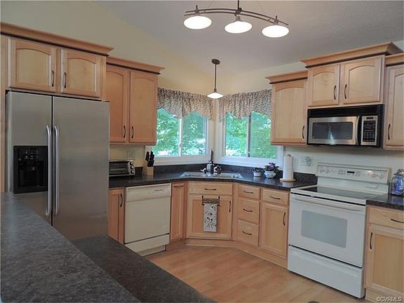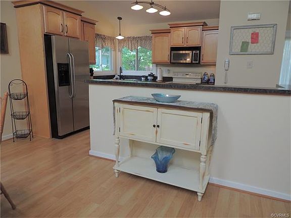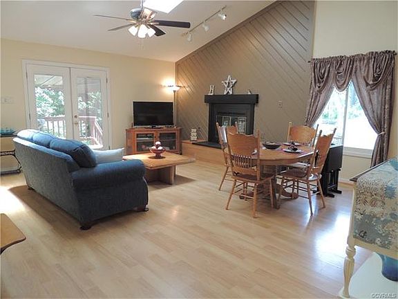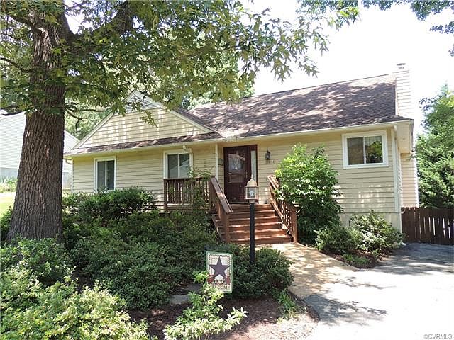 You will enjoy wonderful single-level living in this beautiful, move-in ready home. You'll love the airy & bright look & feel of the open floorplan featuring gorgeous wood laminate floors, vaulted ceilings and skylights. This home features a beautifully updated kitchen that offers gorgeous cabinetry, island, pantry, and a large, corner picture window. The sunny kitchen is open to an oversized great room which features a fireplace, and opens through beautiful French doors to the large covered deck, further overlooking a cobblestone patio. This allows for great flow while entertaining, and adds useful outdoor living and entertaining space within the private, fenced back yard. There are three spacious bedrooms with plentiful closet space, with the master having rear deck access. Additional features include a nicely landscaped yard, paved driveway, fantastic front porch and attached shed. Upgrades include new roof 2010, new HVAC 2011, replacement windows, updated bathrooms with tile floors; leaf protection gutters. All of this, conveniently located close to Short Pump, shopping, schools, and I-64.