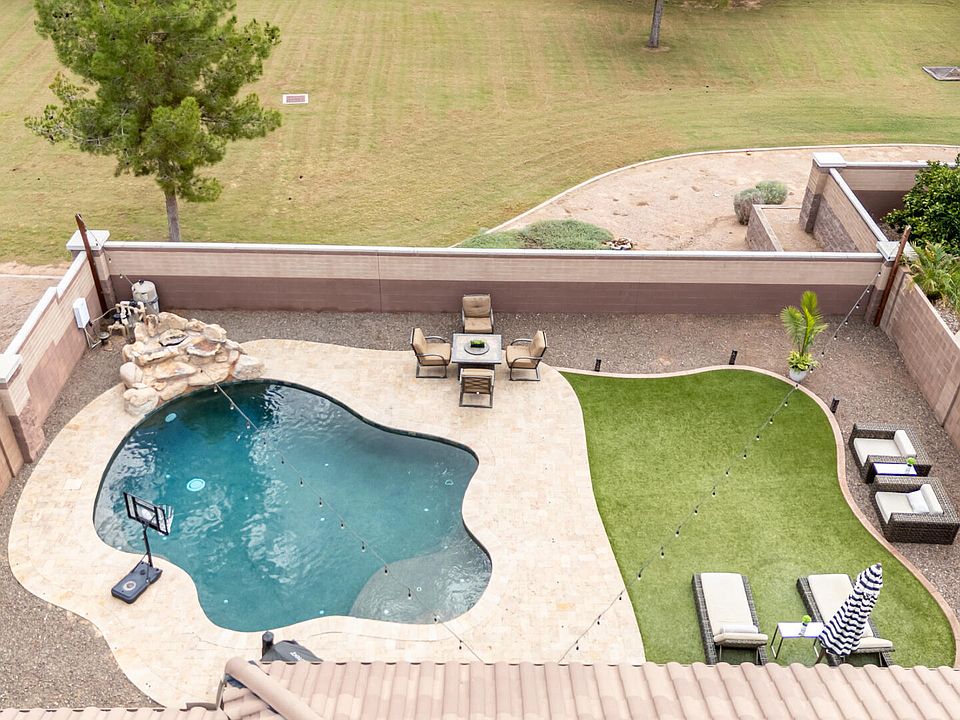 Overhead garage storageCovered patioTurf lawnOpen layoutBackyard oasis with poolPaver drivewayPrivate front courtyard