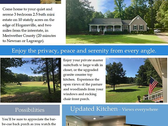 Country living, elevated. Come home to your quiet and serene three (3) bedroom 2.5 bath mini estate on nearly 10 stately acres on the edge of Hogansville and two miles from the interstate in Meriwether County (20 minutes to Newnan or Lagrange). Enjoy your private master suite/bath with large walk in closet, or the upgraded granite counter top kitchen. Experience the open views of the pasture and woodlands from your windows and rocking chair front porch. You ll be sure to appreciate the bar-be-cue back porch as you watch the deer roam by. Separate workshop/barn (i.e., game room/man cave), along with three paddocks included. Possibilities are limitless hobby farm, grow your own vegetable, or keep horses. This can be your private country hideaway, without being too far from anything! All utilities and yard upkeep responsibility of tenant;