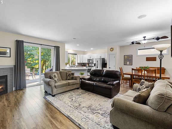 Welcome to this inviting 4-bedroom, 2.5-bath home in the highly sought-after Sunset Ridge neighborhood. The spacious great room flows into the dining area and updated kitchen, where you’ll find quartz countertops, shaker cabinets, stainless steel appliances, and easy access to the backyard through a sliding door. Step outside to a covered patio overlooking the private backyard, complete with a fire pit and raised flower beds perfect for relaxing or entertaining. Behind the home, a trail leads to an open area with a small creek that runs year-round, adding to the natural charm of the setting. Upstairs, you’ll find all bedrooms and the laundry room for added convenience. The primary suite features a private deck, walk-in shower, dual vanities, and a walk-in closet. One of the four bedrooms is non-conforming, offering flexibility for a home office, guest space, or loft area. As part of the Sunset Ridge community, you’ll enjoy access to a clubhouse with a pool, spa, sport courts, playgrounds, gym, and more. Conveniently located near schools, dining, freeway access, and PDX airport, this home offers the perfect balance of comfort and lifestyle.
