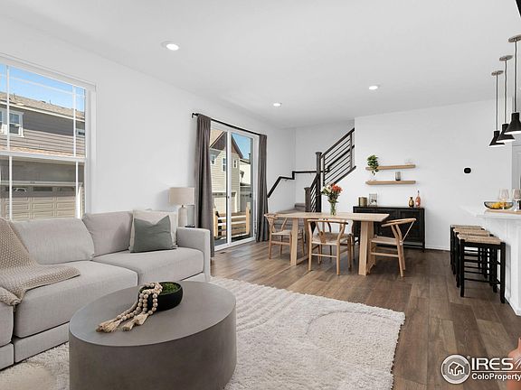 Nestled in the heart of Colliers Hill, this captivating 3-bedroom, 3-bathroom paired home offers the perfect blend of convenience and luxury, all while boasting stunning mountain views that are sure to take your breath away. A picturesque covered front porch greets you, inviting you into a world of timeless beauty and modern comfort. Step inside, and you'll find yourself in an inviting space flooded with natural light. The expansive great room exudes warmth and coziness, with a charming fireplace as its centerpiece. The kitchen has on-trend white cabinetry, gleaming quartz countertops, and a neutral paint palette that caters to all tastes and styles. The large center island doubles as a breakfast bar, making it the ideal spot to enjoy your morning coffee or entertain guests while you prepare delicious meals. Engineered wood flooring graces the main level, and seamlessly flows to the upstairs loft. You can't miss the sleek and modern black metal horizontal stair railings that lead you to all three bedrooms which are thoughtfully arranged. The split-room layout, with a loft in the center, ensures privacy for everyone. This versatile loft space can become a playroom, a second living room, or a dedicated office. The primary suite is a true haven, complete with an expanded walk-in closet, a spacious shower, and a dual-sink vanity. Step outside to discover the fenced-in side yard, featuring an extended patio and pristine turf. This outdoor haven is the ultimate setting for entertaining, all while soaking in the spectacular mountain views. With a two-car garage, you'll have ample space for vehicles and storage. The prime location provides easy access to Denver, Boulder, Fort Collins, and a network of scenic bike paths leading to the community clubhouse and pools. Explore the charm of downtown Erie with its shops and restaurants, all just a stone's throw away. Location, Location, Location! Don't miss the opportunity to call this sanctuary your home!