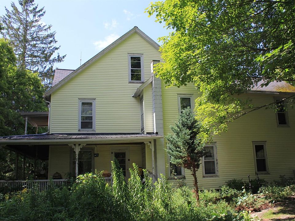 Two story farmhouse ~ five bedroom two bath on four acres. Wrap around porch, many original wood floors and built-ins. Walk up attic that could be an amazing studio or master suite. There is a barn which is in disrepair. Currently private, however with removal of a few trees there could be a lovely view. With a little love this old girl could shine on!