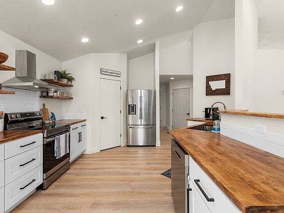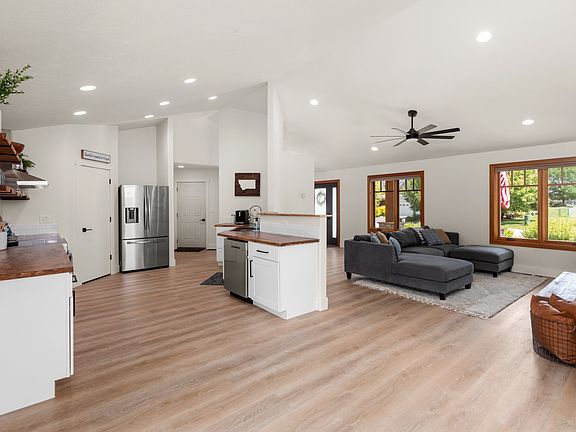 Totally remodeled amazing home in the Meadows at Rocky Cliff in beautiful Kalispell Montana. This 4 bed, 2 bath, 2000 sqft single level living home is in a mature subdivision on over half an acre, just minutes from Flathead Lake. Amenities include: vaulted ceilings, open floor plan, gas fireplace, new HVAC system in 2021, dining room remodel addition in 2011. A complete remodel has been done in 2023- all new stainless appliances, cabinets, counters, tile, sinks & faucets, carpet, Luxury vinyl plank flooring, paint, trim, lights, fans - fully fenced backyard with orchard, entertainment patio, and beautiful Shelter Valley Mountain views. Easy access to HWY 93 and 2 world class ski resorts & Glacier National Park. Agent is related to seller. Contact Jen Arterbury at 406-471-9361 or your Real Estate professional.