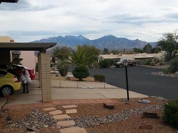 For more information on this property, contact the Listing Agent, Janet Petzler at (520) 405-2862 or JanetP@LongRealty.com. Unusual end unit in an excellent location.Features mountain views to the north and east and you can enjoy sunrise and sunsets because of the common area on the west side. This townhouse had a dining area added onto it years ago which makes the kitchen so cozy. Very well maintained and move-in ready, plantation shutters, Arizona room, large covered back patio with views that stretch for miles.Bath counter-tops done by a Tubac artist. New heating a/c unit two years ago.
