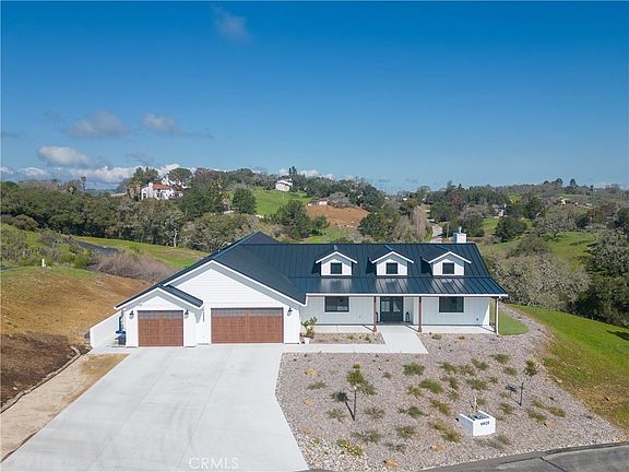 Incredible views of the surrounding hills from virtually every room of this exceptional, nearly new ~3928 sqft, 4 bedroom 3.5 bath home. Contemporary farmhouse design features an open concept floor plan with vaulted ceilings, French oak floors throughout the main living areas and tile flooring in the bath rooms and laundry. The well appointed kitchen features all Thermador appliances, suede quartz counters, custom soft close cabinetry by Morro Cabinets, walk-in pantry, and a double island with seating for 10. Sliding glass doors lead from the living room with fireplace out to the spacious covered patio with panoramic views, low maintenance artificial turf and multiple seating areas for entertaining and enjoying the stunning sunsets. The sophisticated owner's suite features vaulted ceiling, dual walk-in closets, sliding glass door access to the back patio and a luxurious spa-like bath with heated floors, walk-in shower and separate free standing soaking tub. All showers feature dual shower heads including rain shower heads. The versatile floor plan includes 3 additional bedrooms (1 en-suite) and office with pocket doors and a laundry room with sink, cabinets and counter space. So many wonderful features in the home including Owned Solar, Electric car charger, Bosch Alarm system, Ring cameras, Indoor/Outdoor speaker system and owned soft water system to name a few. From highway 101, you'll meander uphill, away from the masses, to arrive at your private, luxury home in about ten minutes. Located within 3-F Meadows, this home is nestled in a desirable microclimate offering cooler summers and warmer winters with coastal influence rolling in through the surrounding hills. Within a 30 minute drive, you can relish in many of the central coast's best offerings: Paso Robles wine country, Morro Bay, Cayucos, downtown San Luis Obispo, and many local hiking trails and beaches. 10 minutes down the hill includes access to Atascadero's many great restaurants, community parks, the lake, the zoo, shopping, and live events at Sunken Gardens. Don't miss the opportunity to live the central coast lifestyle in a home that offers privacy, serenity, stunning views, and posh amenities, centralized within the central coast's endless opportunities for fun and relaxation!