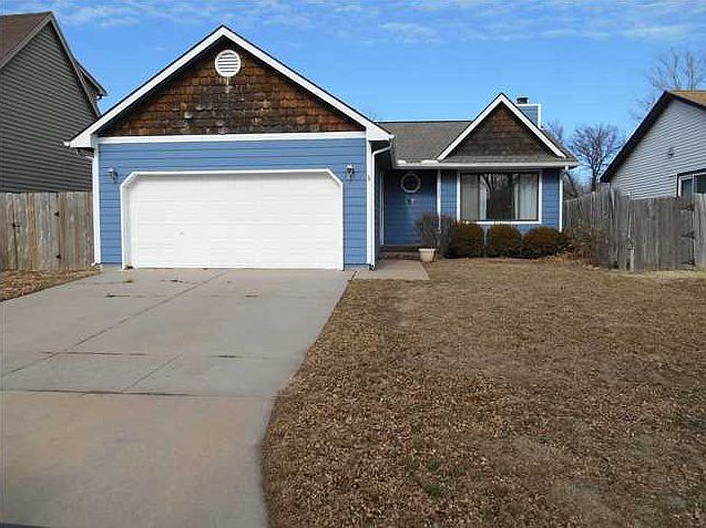 This nice 3 bedroom 2 bath home is move-in ready and nestled in a family friendly neighborhood in the Goddard school district. The main floor plan boasts an open floor plan with a beautiful wood burning fireplace in the living room. The master bedroom has an exit to the covered deck. The upstairs bathroom has two sinks for the rush before school or work. Downstairs is a cozy family room and a huge bedroom with a walk-in closet.