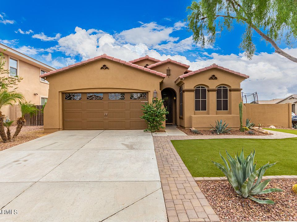 Over 100K in upgrades. Gorgeous home with an excellent curb appeal nestled on a corner lot is looking for its new owner! Inside, you'll find a captivating open floor plan boasting high ceilings, recessed lighting, wood-look flooring, archways, stone-wall accent, fireplace, & sliding glass doors to the back. Stunning kitchen showcases quartz counters, a stylish tile backsplash, an island w/a breakfast bar, & beautiful wood cabinets w/crown molding. Primary retreat features an ensuite w/dual sinks, a glass shower, & a walk-in closet. Other bedrooms enjoy a walk-in closet. Relax in the perfectly-sized backyard w/a covered patio, pavers, green lawn, & a swimming pool w/water features! Visit today!