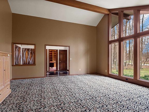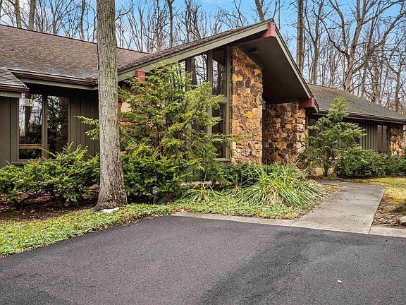 Rare architectural modern inspired 3 BR plus den (optional 4th bedroom) RANCH with finished basement that sits on nearly one acre wooded lot in desirable Woodmont subdivision. One of a kind African Mahogany front door welcomes you into foyer featuring vaulted ceiling and onyx tile flooring. Formal living room has impressive soaring ceiling and large picture windows that let natural light pour in. Kitchen was remodeled with custom natural hickory Grabill cabinets, Zodiac quartz countertops, custom stone work using Indiana rock, double ovens, two cooktops (one gas and one electric), prep sink, wine cubbies, tons of storage with pull outs, large pantry, abundance of counter space and beautiful accent lighting below and above cabinetry boasting cathedral ceiling. Breakfast nook along with formal dining room. Family room looks out to beautiful wooded lot, has stone fireplace and wood beams accenting ceiling. All bedrooms plus den are on main floor. Master bedroom has cathedral ceiling and bath en suite. Master bedroom has two closets (one large walk-in). Master bath has been remodeled featuring Maxx heated jet tub offering chromotherapy and custom waterfall faucet, heated granite tile flooring, and an amazing walk-in marble tile shower with Kohler body jets, rain shower head and pull out shower head for easy cleaning. Master bath is has Kohler sinks, Kohler faucets and Kohler double flush toilet. Second full bath on main has also been remodeled with high end materials including Kohler sinks and Toto toilet. Basement has large rec room and family area with fireplace. Basement bath is plumbed for a possible future full bath. Custom window treatments throughout. Garage is spacious with floored attic storage and 220V plug. 46' deck (stained 2019). Irrigation in front yard. Security system. Commercial grade wool carpet. Roof has 30 year shingles (2001 complete tear off). Driveway resurfaced in 2019. Chimney rebuilt in 2014. New gutters in 2019. High efficiency furnace, A/C and electric heat pump (around 2010). Whole house exhaust fan. Whole house humidifier (2010). 85 gallon water heater. Water softener included. All kitchen appliances stay as well as washer and dryer. (Garage fridge and freezer do not stay.) Conveniently located near walking trails, YMCA, shopping and dining. Association has community area with pond. Video walk thru upon request.