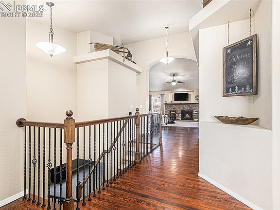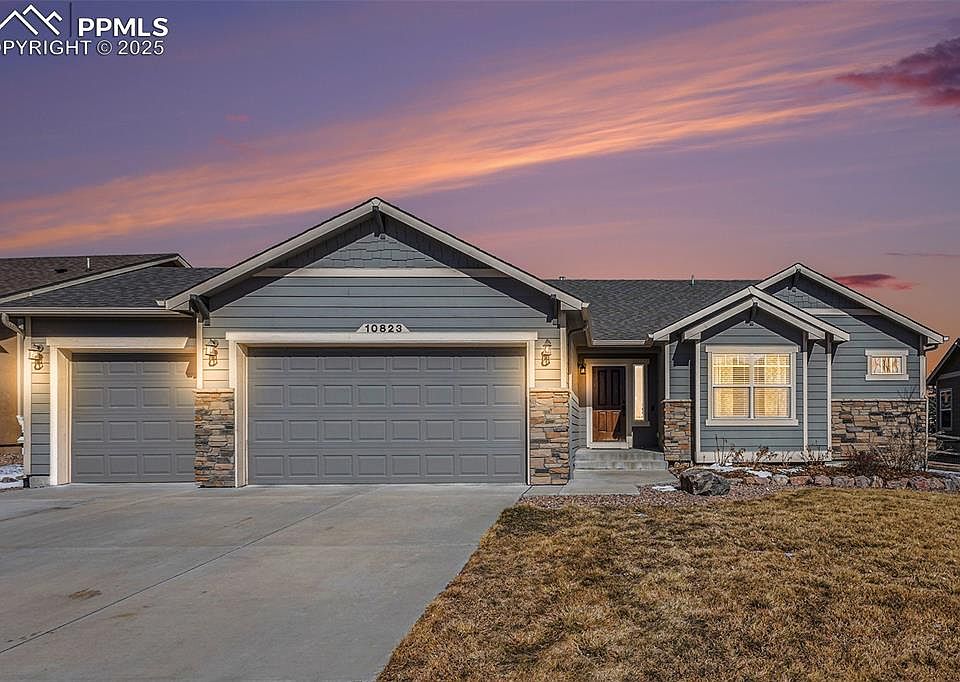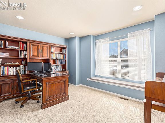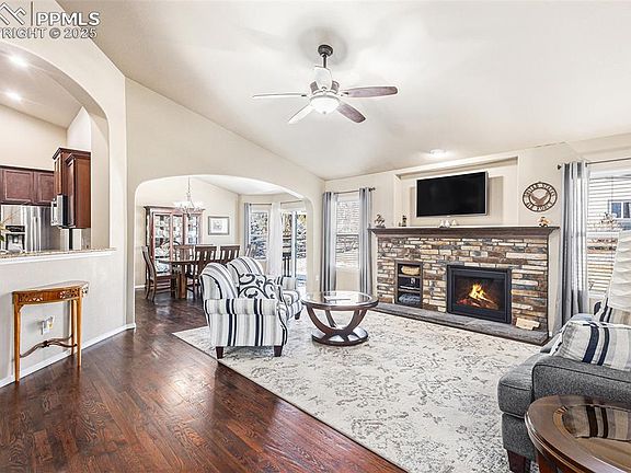 Welcome to this absolutely spectacular, better than new, semi-custom home built by Campbell Homes, boasting exceptional design and high-end finishes throughout. This 4-bedroom residence, complete with an office featuring elegant French doors, offers both comfort and style in every corner. The main level welcomes you with real hard wood floors and vaulted ceilings, creating an open and airy ambiance. The kitchen is a chef's delight with gas cook top, double ovens, and a walk-in pantry. This space is further enhanced by a separate dining room perfect for entertaining guests. The large master suite is a true retreat with its vaulted ceilings and the adjoining master bath with walk in closet. The secondary bedroom on the main floor includes an en-suite bathroom. This setup is ideal for additional living space or accommodating guests. The finished basement features 9 foot ceilings, a recreational/theater room with a wet bar - ideal for movie nights and gatherings, a living room, 2 spacious bedrooms, a full bathroom and a little nook under the stairs – a perfect little play area. Additionally, there is a 3-car garage, ensuring ample parking and storage space. The custom landscaping enhances the exterior, creating a picturesque setting for this top-tier property. Across the street from the golf course and all the amenities that Meridian Ranch has to offer and with its A+ design and outstanding features, this home stands out as a true gem in the real estate market. Don't miss the opportunity to make this dream home yours.
