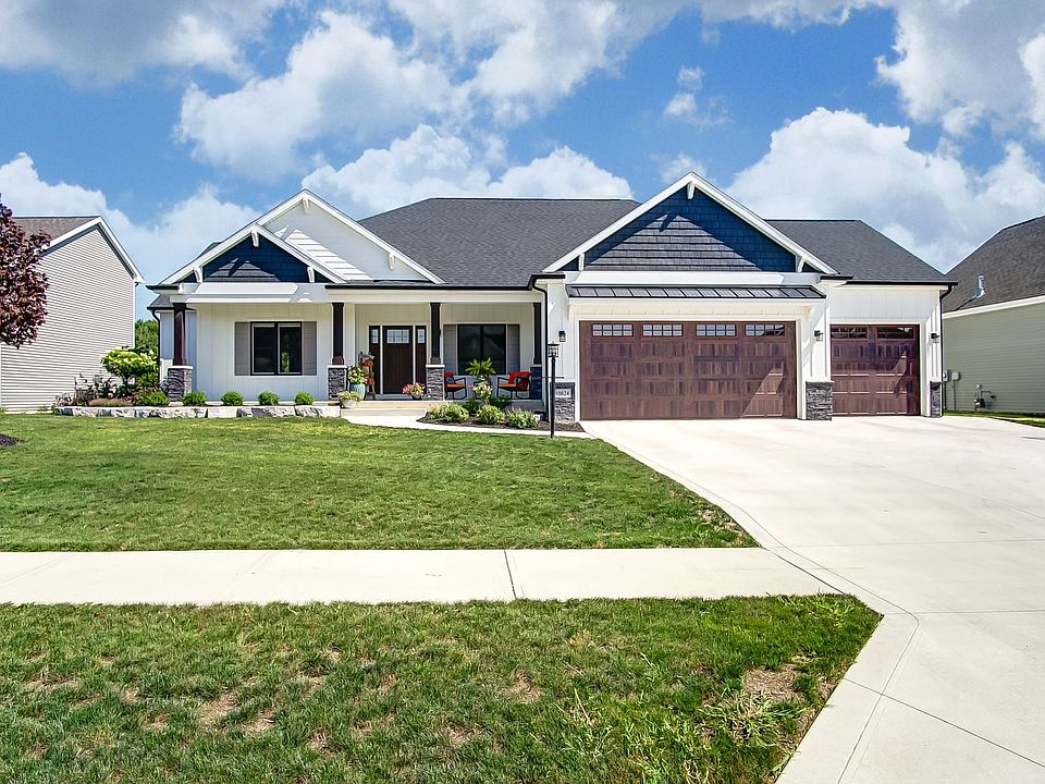 Welcome home to the fabulous Eagle River subdivision located in the coveted Leo school district. This newer contemporary home offers 4 large bedrooms, 3 full bathroom, open concept living, and a great daylight walk-out lower level! It has Smart Home capabilities, with the thermostat, security system, and 3 car garage all being able to control from your phone! Inside provides a huge open floor plan and an abundance of natural light. The great room has a cathedral ceiling and a spectacular floor-to-ceiling stone fireplace. The kitchen features a large island, beautiful quartz countertops, open shelving and top of the line appliances. There is a huge walk-in pantry for additional storage also! There are 3 generously sized bedrooms on the main floor, including your master. The master bathroom has a double sink vanity, a large garden soaking tub, and a great separate tiled shower with dual shower heads. And you won't run out of room for all of your clothes, shoes, purses, etc. in the over sized walk-in closet with an intricate organizing system. A large laundry room and a drop zone next to the garage finish off the main floor. In the lower level, you have a full bathroom, bedroom w/walk in closet, two large living spaces and a full bar for entertaining. There is an unfinished space that is the perfect spot for a home gym or a workshop. Surround sound is throughout the home and it does have a Cat 5 in every room. The backyard is nice and private with a huge treeline behind it. This home was just built in 2018 and has top of the line everything! Amazing landscaping and curb appeal, paired with all of the amazing amenities inside will have you wanting to make this your new home today!