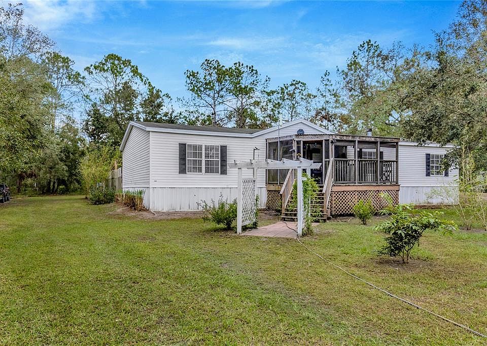 Nestled on a peaceful, unrestricted 0.93-acre lot, this beautifully maintained 3-bedroom, 2-bathroom manufactured home offers a perfect balance of comfort, style, and outdoor enjoyment. Brand NEW ROOF to be installed prior to closing with executed contract! Brand new water heater recently installed as well. Located in a serene setting with no HOA or deed restrictions, this property provides the freedom to make it your own. Step inside and be greeted by a spacious and inviting living room, ideal for both cozy nights in or entertaining guests. The chef-inspired kitchen features ample counter space and a charming eat-in area, perfect for casual dining. Luxury vinyl flooring throughout the home ensures a modern, low-maintenance living experience. The primary bedroom serves as a private retreat, complete with an en-suite bathroom for added convenience and relaxation. Two additional bedrooms and a second full bathroom provide plenty of space for family or guests. The cozy family room with a fireplace adds warmth and character, making it the perfect spot for unwinding. Step outside and discover your own private backyard paradise. Take a refreshing dip in the above-ground pool, surrounded by a privacy fence for ultimate seclusion. The spacious patio is perfect for grilling, outdoor dining, or simply enjoying the peaceful surroundings. The property also features raised garden beds with a built-in watering system, fruit trees, and mature landscaping, creating a tranquil, nature-filled atmosphere that’s ideal for gardening enthusiasts. For hobbyists or those in need of extra storage, you’ll love the two large workshops that allows for ample space for projects, tools, and has 100-amp electrical service ran to them. The entire property is securely enclosed with a chain-link fence around the perimeter, providing peace of mind. Energy-conscious buyers will appreciate the solar panels installed to help lower utility costs, providing sustainable energy while keeping bills down. This home is a true gem, offering the perfect blend of modern living, privacy, and outdoor enjoyment. Don't miss the opportunity to make this property your forever home!
