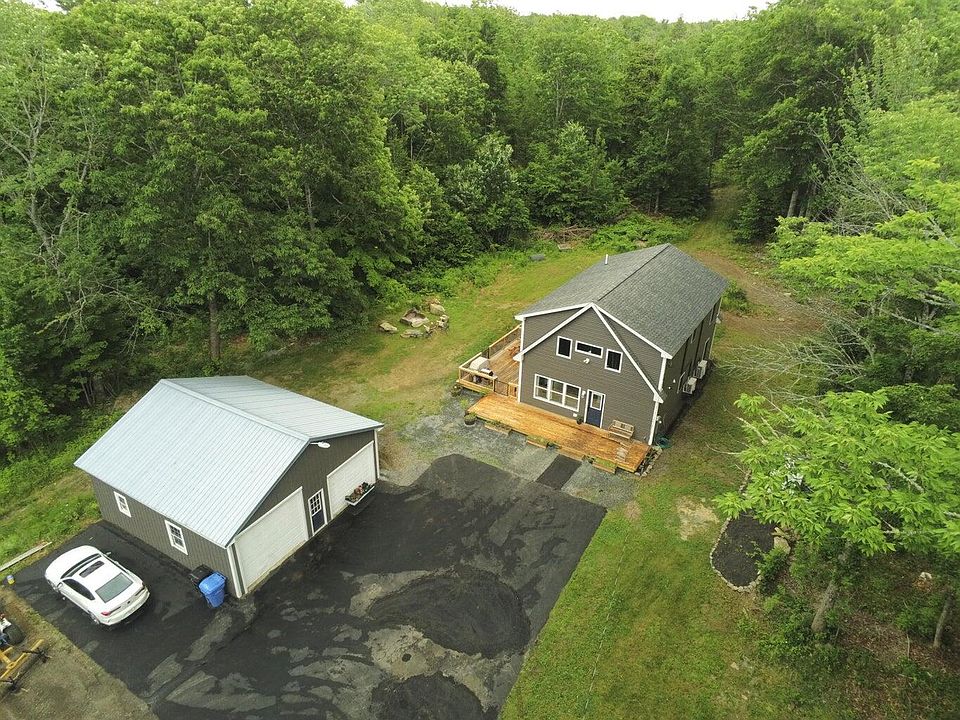 This low maintenance home sits on 10 acres and is just minutes from the interstate! Enjoy simple living with a massive kitchen and living area on the first floor and 2 bedrooms, a full bath, and a laundry room upstairs. Take in the privacy of the 10 acres from one of two decks or patio! In the summer, have friends and family over for a game of horseshoe and fire! This home is truly built for entertaining! No basement? There is plenty of room in the oversized metal 2 bay garage.