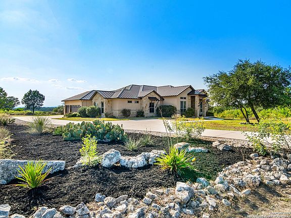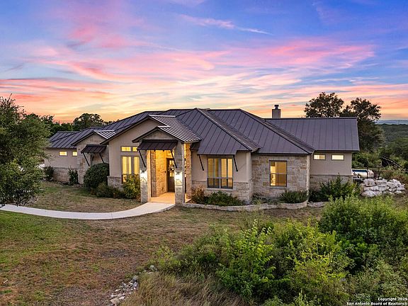 Set on 3.3 acres in the gated Summit Ridge community, this single-story custom home offers privacy, functionality, and striking Hill Country views. Designed with an open layout and thoughtful finishes throughout, it delivers both everyday comfort and an ideal setting for entertaining. Inside, the gourmet kitchen stands as the centerpiece with professional-grade Viking, Thermador, and Bosch appliances, complemented by custom cabinetry and expansive living and dining spaces. Wide-plank wood tile flooring carries throughout the main areas with no carpet in the home, while touches like touchless faucets, built-in cabinetry, and a flexible bonus room enhance convenience. The garage includes a workbench and additional storage, and energy-efficient details such as a tankless water heater, in-wall pest system, blown-in insulation, and dual Trane HVAC units provide peace of mind. Outdoors, the property transforms into a resort-style retreat. A sparkling pool and spa anchor the backyard, complete with an outdoor fireplace and grill for gatherings. The expansive lot offers unmatched privacy with no rear neighbors, while the west-facing orientation frames dramatic sunsets over rolling hills and Medina Lake. With its quiet setting, custom design, and seamless blend of style and function, this home captures the essence of Hill Country living.