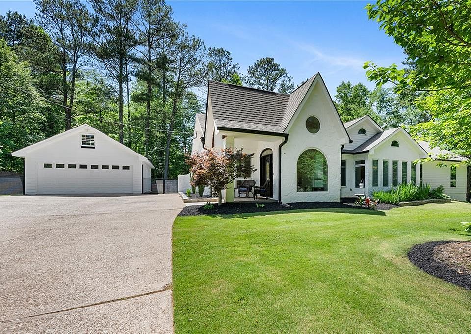 The main house at Wiley Bridge and its two accessory buildings are set within private, gated and fenced, beautifully landscaped grounds with tree-lined borders. This substantial yet charming home, with its painted stone and architectural accents, offers enticing curb appeal and an abundance of opportunity. Flexibility abounds; whether it's the open-plan interior layout—a flowing space to entertain in, and enjoy— the potential for multi-generational living, or the opportunity for rental income from the expansive daylit terrace level suite. Additionally, the carriage house garage's unfinished attic space and the approximately 2,500 sq. ft. workshop building's main and upper levels provide endless possibilities for hobbyists, car collectors, home business owners, or tenants & rental income; all are options for exploration. The main residence features a primary suite on main, guest accommodation and a bathroom upstairs, and additional bedrooms and bathrooms in the terrace level, which is also stubbed for a full kitchen installation. Porches and patio areas connect the house to its grounds, with many leading directly to the main lawn area, which could accommodate a pool. The two accessory buildings enhance the privacy of the main house’s gardens, yet allow ample space for guest and resident parking. The carriage house garage is sizable, able to easily accommodate two full-size pickups or SUVs while retaining storage space on the rear wall. The attic could be converted to living or work space, but currently provides additional storage. The workshop building is large but situated to feel separate from the main home and grounds; with its own gated driveway access and even larger semi-finished attic space, the workshop will readily meet the needs of most car collectors or home businesses. Benefiting from proximity to Woodstock, Historic Roswell, downtown Crabapple, and Milton, but with Cherokee County taxes and no HOA, the ultimate use of this property will be limited only by the creativity of the new owner. Priced below recent appraisal. Visit Wiley Bridge & dream big!