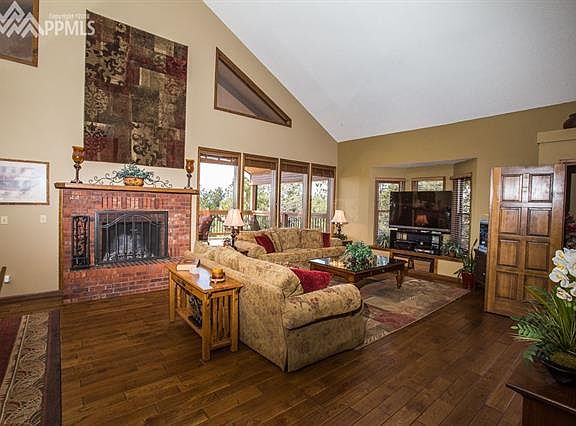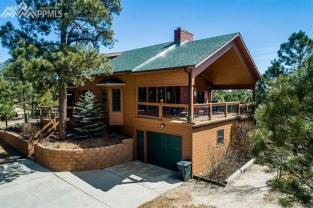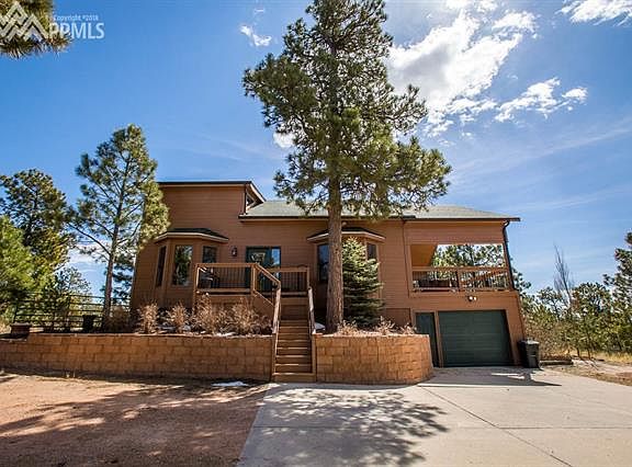Sought after close-in location in SW Black Forest on 5 acres heavily treed with gorgeous Pikes Peak and mountain views!! Upon entering the home you are welcomed by a bright and open great room with soaring cathedral ceilings, beautiful hardwood floors, large windows, wood burning fireplace with brick surround and a walk-out to the HUGE 32x17 covered deck to take in the serene setting and gorgeous mountain views. Don't let the address fool you - the home was precisely placed on the back of the lot for maximum privacy!! Remodeled kitchen with granite transformation counters, stainless steel appliances, down-draft Jen Air range with built-in grill, extra high cabinetry for maximum storage, kitchen pantry and an island with breakfast bar which is perfect for entertaining your guests while in the kitchen. The home was built with several master suites. The main level bedroom is spacious with a bay window, walk-in closet and hardwood floors. The laundry is on the main level and close to the main level bedroom. Newly remodeled main level full bath with beautiful tile and custom wood ceiling. The large upper master suite has private entrance, hardwood floors, walk-in closet, sitting area and a 5 piece fully remodeled bath with double granite vanities, large soaking tub and separate shower. Fully finished walk-out basement with dog run, spacious family room with walk-out to private patio, wood burning fireplace with brick surround, custom built-ins, wet bar which could be modified for a secondary kitchen, en-suite bedroom and large bath. Multiple outdoor entertaining spaces - large covered deck, front deck and basement patio. The property includes two outbuildings - barn and workshop which are being included as-is. No covenants or HOA. Zoned for horses. Domestic well.