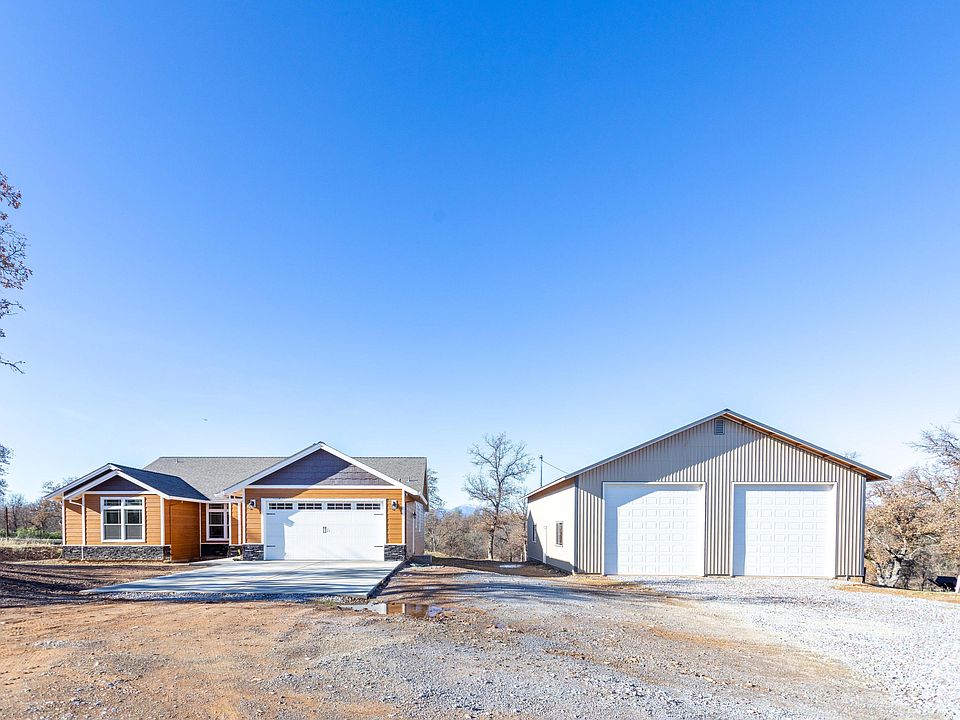 Beautiful New 3 bedroom w/office, 2.5 bath 2113 sq ft home on 5 acres with seasonal creek. 40x48 shop with Bathroom, laundry room, woodstove, partial kitchen and 2 bedrooms (unpermitted), 2-13' roll up doors for RV parking. Open split-floor plan. Kitchen offers maple cabinets w/knotty alder doors, subway tile back-splash, pantry has pull out soft closing drawers .