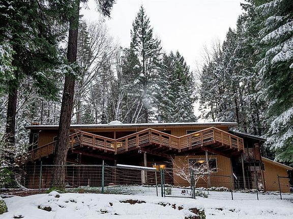 Entering your circular drive, this 2,585 square foot home with 3 bedrooms and 3 baths sits on 8+ acres and has amazing Deer Creek frontage. Stepping into your entry, you are welcomed into the living and dining area which is an open floor plan with vaulted ceilings and a fireplace. The kitchen has a pantry, eating area, and access to the new expansive deck. The Master Suite has a walk-in closet with a slider to the rear deck as well. The 2nd bedroom is spacious and has a walk-in closet. The large laundry room has lots of storage, sink, and access to the breezeway leading to the 2-car garage and fire wood access elevator. The lower level offers a large living room with a bedroom, bath, a large basement that is easily accessed for storage, and has inside and outside access with its own private deck. This could easily be a separate living unit/guest quarter. There is an additional detached 3 car garage/shop. An easy walk to Deer Creek. Great location! Minutes to NC.