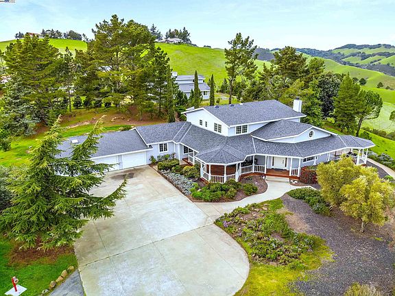 Enjoy stunning views of the Los Vaqueros Reservoir, Great Central Valley & Sierra Nevada Mtns. Fabulous 10+ Acre property bordering pristine watershed land, private & tranquil, yet only 15 minutes to 580 fwy! Beautiful residence & Barn! Main level great room, leads to spacious gourmet kitchen, formal dining room & laundry room with cabinets & sink, large bathroom & two secondary bedrooms one with its own sitting room & doors to the exterior--perfect as an in-law unit/teen retreat! Enjoy gorgeous sunrise views from the primary suite with its own balcony. A 4th bedroom/bath & large loft/library complete the 2nd level. Attractive exterior of home has expansive wraparound redwood deck an entertainers delight!. A 3+ car garage with cabinets, room for a workshop & paved driveway. HUGE Barn has Workshop/6 stalls/Loft and a Well Pump House. Property includes inground Well, Two 5,000 gallon Water Storage Tanks, Fire Hydrant, newer electrical panel & HVAC system, 2 Ecobee thermostats, newer Milgard windows, plenty of parking space, potential for ADU & more! 1 mile to SRVF Volunteer Fire Station. 2 miles to Morgan Territory Preserve park accessing 90,000+ acres of open space.