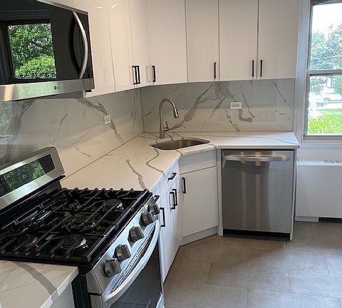 Jr 4, 2 BR, 1 Full Bath, newly renovated, high-rise, central heat/air-conditioning, 24-hour doorman, half block to express subway, 2 blocks from LIRR, next to library, pet friendly, parking available.