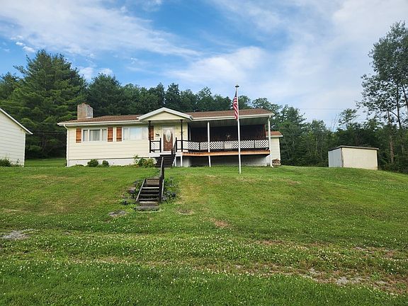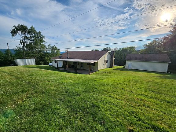 Ranch home is ready for its new owners with a large living room with fireplace, spacious kitchen with dining area, convenient first floor laundry room, family room with pellet stove, and 3 nice sized bedrooms. Property is set to take in sweeping views. Detached garage features overhead doors, tall ceilings, mechanics lift, and electric. Back covered patio for relaxing in the summer. Large 1.4Acre lot.