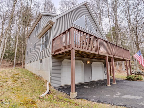 Welcome to your mountain escape--a fully furnished 3-bedroom chalet tucked within the amenity-filled Wallenpaupack Lake Estates community. Built in 2007, this home offers a perfect mix of comfort, style, and convenience in the scenic Lake Wallenpaupack Area.From the moment you walk in, you'll be drawn to the open-concept design featuring soaring ceilings and a dramatic floor-to-ceiling stone fireplace. Large windows allow natural light to pour in, illuminating the hardwood floors and creating a bright, cozy atmosphere that's ideal for both relaxing and entertaining.The main level offers a generously sized primary bedroom with its own private deck--perfect for enjoying peaceful mornings with a view of untouched woodland. The kitchen features plenty of cabinetry, modern appliances, and flows effortlessly into the dining space. Upstairs, two additional bedrooms and a loft area offer flexible options for guests, work-from-home space, or a quiet reading nook.A two-car attached garage adds everyday practicality, offering easy entry and extra storage for seasonal gear or lake toys.Step outside and enjoy nature at its finest--with no neighbors behind you, the wooded setting offers privacy, tranquility, and the feeling of being tucked away while still part of a vibrant community.As a homeowner in Wallenpaupack Lake Estates, you'll have access to lakes for boating and fishing, swimming pools, beaches, sports courts, and more.Just bring your suitcase--this home is being sold fully furnished and ready for you to move in and enjoy. Whether you're dreaming of weekend getaways or a year-round lifestyle, this gem delivers.