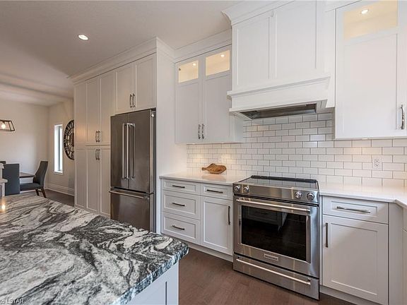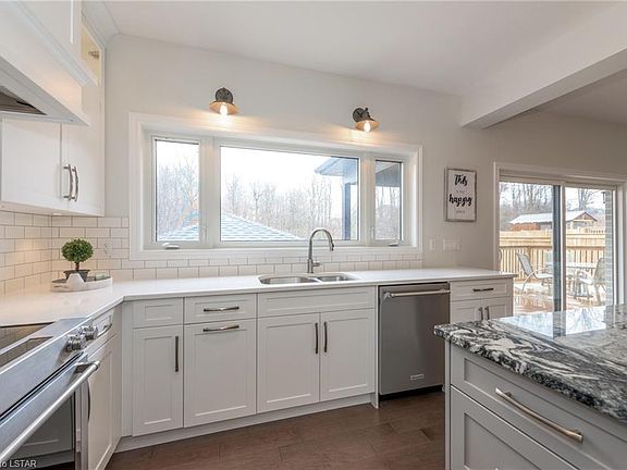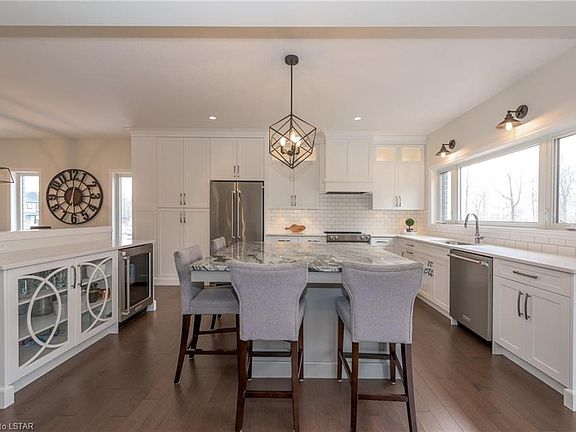 Spend evenings relaxing in your covered hot tub watching deer wander through the forest. Beautiful exterior, covered front entry - step inside to an abundance of natural light and lush treed views spanning the back of the property. Rich hardwood flows through the main floor and continues through the second level. Open concept living encompasses expansive eat in kitchen with crisp white cabinetry, 63" x 63" centre island w/ sleek granite surface, large eating area & inviting great room w/ focal fireplace, built-ins & floating shelves. Partial wall defines dining room while drawing it into the open space. Private main floor office. Mudroom w/ built ins & cubbies. 2nd floor adds 4 bedrooms including Master suite with double walk-in closets & large 5 piece ensuite w/ gorgeous tile/glass shower & stand alone tub. 5 piece main bath. Fully finished lower level adds large windows, 3 piece bath, 5th bedroom, rec room & media room w/ projector screen. Outdoor living enjoys multi level decks.