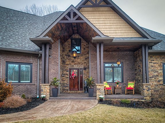 This unique one of a kind home is situated in the prestigious Eagle Ridge Estates section of Eagle Valley subdivision on Evansville's north side. This home will be easy to remember with its beautiful stone & brick exterior and the extensive use of landscaping not to mention the soaring 2 story covered front porch all of which adds to the awesome curb appeal. The owners have recently added an extensive amount of additional landscaping and fencing done to the already meticulously maintained tree filled lot. This home boasts a Rustic natural elements architectural design on the outside with a surprisingly unique modern twist once you enter the home. The Interior features include very spacious rooms, vaulted ceilings a Huge Stone corner Fireplace and awesome views of all the main level living areas. This impressive home offers the amenities you should expect including quality, design and detail. The Entry features indirect lighting on a stone wall in the end of the entry along with dramatic detail on a back lit ceiling above the Great room not to mention a beautiful huge corner stone fireplace in the great room. Entertaining will be a joy in this kitchen and should delight the chef in your family not to mention the abundance of gorgeous custom cabinetry, granite counter tops, gas range with a custom hood, free standing double oven a Butler's Pantry and a raised breakfast bar. The large main Level master retreat features a wall of windows providing awesome views of the grounds. The large master bath features a fully accessible custom tiled walk-in shower a large double vanity and a separate make up area. The master suite has 2 very spacious walk-in closets complete with custom built-ins and offers direct access to the laundry which has even more cabinets and a granite counter for folding your clean cloths. Rounding out the main level there are two additional bedrooms which share a Jack & Jill bath, an office which is located just off the Entry and has shared access from a back hallway to another full bath. The second level offers three additional bedrooms a full bath plus a large bonus room which would be perfect for a media room or a gaming room. The outdoor living space is very peaceful and was designed for your privacy or hosting a cookout on the 770 square foot covered porch all of which is fenced and surrounded by landscaping mounds, pines and mature trees. The back hallway leads to a very large 3 ½ car side load garage and circle driveway.