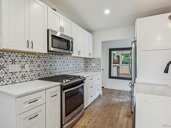 Looking for a fully renovated Mid-century ranch w/ stylish open floorplan? Look no further! Your future home is turn-key, with room for family, friends, pets and your Colorado lifestyle! Not only is this home cosmetically gorgeous, but also features new electrical wiring & insulation(2022) auto irrigation & landscape(2023), AC, sewer line, Rn mitigation(2018). When you pull up, take in the new professional landscape, with very cool Xeriscape accents. Entering the kitchen, your eyes will be drawn to the new quartz counters and cabinets, but don’t forget to look up. Yes, those are vaulted ceilings! Sellers went to great expense w/ engineer & contractor to vault the kitchen & dining room. The result is a unique & atmospheric space for entertaining friends & family, or simply snuggling up with your favorite beverage next to a cozy fire. The beautifully refinished SOLID oak floors are to be found throughout the entire main floor. Wow! The kitchen also includes a custom beechwood butcher-block island. You will delight in the seamless easy-living floorplan. The newly installed iron railing gives an open feel to living room & basement entry. The hallway leads to 2 secondary bedrooms, & a completely renovated bathroom with deep soaker tub. The primary bedroom is tucked neatly away from the common spaces & includes ensuite 3pc bathroom w/ fresh updates. Step right out from your kitchen to the south facing backyard. Find yourself in a private, lush paradise you will never want to leave! Perennial plants make life easy, and the covered patio offers cool shaded space. Natural gas connection for BBQ grill. Newly finished basement includes a light & bright family room w/ recessed can lighting. Additional ¾ bathroom and nonconforming bedroom. Huge laundry room w/plenty of storage, plus an additional room for you to put your touches on. Renovation was completed in 2022 w/ permits pulled. The sellers have done an exceptional job updating this home over the past 6 years.