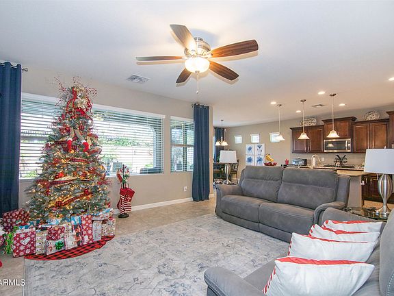 Hot East Mesa location! This 3bdrm PLUS den single level has all of the bells and whistles. The kitchen offers granite counters, gas stove, double oven, stainless steel appliances, built in insta hot, walk-in pantry and upgraded 42'' cabinets with hardware and crown molding. 24'' brick set tile placed in all of the main areas with carpet in just the bedrooms. The back yard is perfect for entertaining- HEATED Pebble-Tec pool with water fall feature, covered patio w/ fan, artificial grass, and travertine tile pool decking. Plenty of storage- cabinets in the garage and laundry room. Other features: RV gate, N/S facing home, utility sink, water softener, lush landscaping, paver driveway, extra attic storage , larger baseboards,