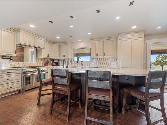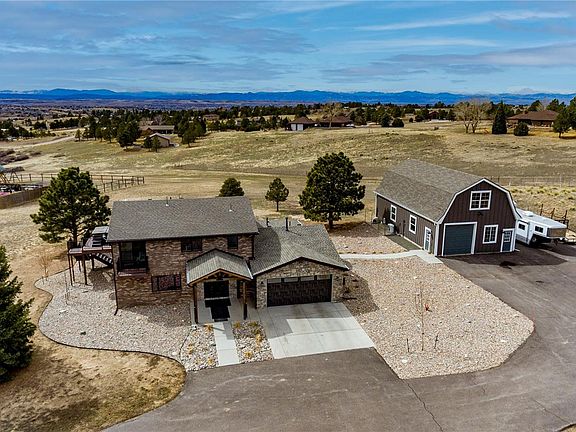 Gorgeous totally remodeled close in Parker home on acreage with spectacular full range mountain views. Large spacious kitchen with center island/eating bar, quartz counters, white cabinets and stainless steel appliances including gas range with 2 ovens and hood. This kitchen is a wow. The adjoining great room keeps it really open and features a pellet stove to take the chill off. The rock wall in this room gives it a mountain feel. The entire main floor is hardwood. The dining room is right off the great room and is highlighted by a shiplap wall. Lovely touches have been added like barn doors and additional shiplap walls. Main floor remodeled 3/4 bath is off the kitchen. Laundry on both main level and in basement. Upstairs is the primary bedroom with a balcony off the front and one off the adjoining bath featuring a hot tub. You will love viewing the sunsets from here and viewing the stars at night. The remodeled bath features tile floor and solid surface counter. The secondary bedrooms and bath are a good size too and have also been remodeled. Downstairs is finished and features a rec room with gas fireplace, bedroom, 3/4 bath, flex room and second laundry. New spray foam insulation on main floor, newer furnace and a/c plus in floor radiant heat on main and upper floor, radiant baseboard heat in basement. Newer insta hot boiler. Enjoy the outdoors and views on your covered deck plus a fire pit area. The outbuilding is incredible and features one high door and 2 additional overhead doors on the side. It is drywalled, cement floor and has a storage room or place for all your tools too. Upstairs you will find an unbelievable finished rec room with additional space to finish more. You will love the shiplap walls and bar area. You will not want to leave. The house and neighborhood are amazing. You will want to make it yours.