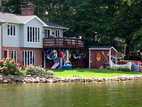 Call Elaine for a private showing today! 269-217-1028! IMPRESSIVE YEAR ROUND LAKE LIVING ON ALL SPORTS 660 ACRE PINE LAKE AT ITS BEST! Spectacular SUNSETS with over 110' of SANDY BEACH FRONTAGE FACING LAKE #2! This BRICK RANCH WALKOUT HOME FEATURES over 1800 sq. ft. of living area with attached 3 car garage (2 up-1 down)! The lake frontage of this home is where the ENTERTAINING BEGINS! NO STAIRS TO THE LAKE and you will be able to walk right into the lower level and find a LARGE FAMILY ROOM with FIELDSTONE WOODBURING FIREPLACE, KITCHENETE, BEDRO OM, FULL BATH and extra HEATED 3rd stall garage to store all of those toys and has electric wench! The MAIN LEVEL features a beautiful OAK KITCHEN with snack bar, pantry, large dining area and GLASS SLIDER DOOR that leads to deck overlooking the lake!