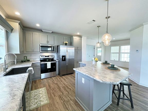 This beautiful, open Skyline home is located in a 55+ age-qualified community, and has everything you're looking for! From the minute you walk in, you'll notice the refined elegance. Kitchen features stainless steel appliances, soft close drawers and cabinets, oversized angled island with room for seating, built-in microwave, and pendant lights over the island. Spacious master bedroom boasts a huge walk-in closet and windows for lots of natural light. En suite master bath features a stunning euro glass walk-in shower and double vanity. Luxury vinyl plank flooring throughout ensures easy clean up. Split floor plan has two additional bedrooms and a guest bath with counter height vanity. Outdoors you'll find a covered carport, storage shed, and back patio for relaxing or grilling. This is a premium location, backing to trees and nature! Landscaping and sprinkler system are already installed, so just move in and enjoy! Call today for a personal tour of this lovely new home!