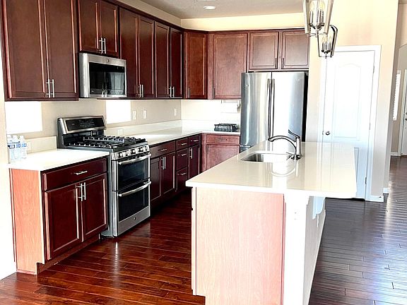 Beautiful 5 bedroom home in meridian ranch! The home features a main floor master, open living and an office. The main floor features a kitchen with a HUGE island, plenty of cabinet space, stainless steel appliances and a gas range. The main floor also features living space, dining space, an office, laundry room and the primary bedroom with 5-piece bath and walk-in closet. The upstairs features another large living space with cabinetry with space for a mini fridge and four additional bedrooms. The home backs to open space and has xeriscaping. The home also includes a massive three car garage. Access to all that meridian ranch has to offer. Don't miss this. Make it your home today! Tenant is responsible for all utilities. Security deposit is due at lease signing ($3100). No pet rent and no pet security deposit.