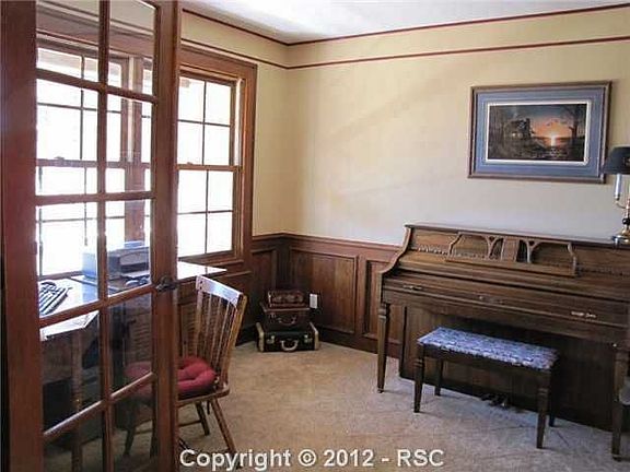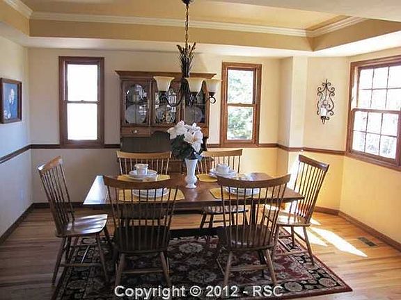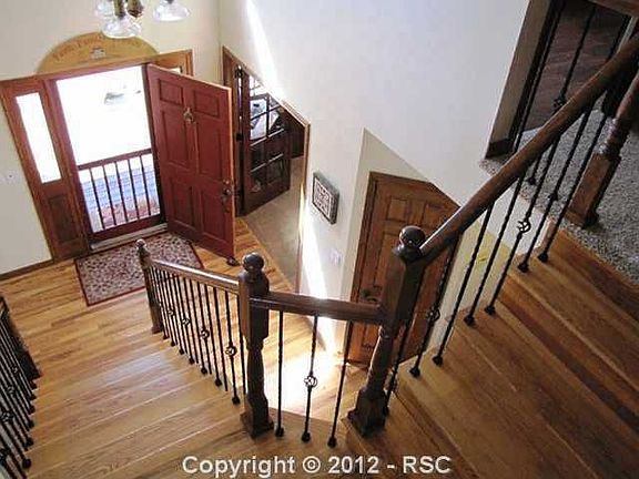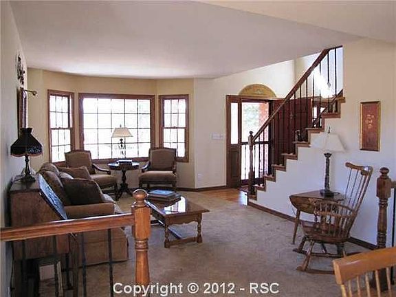 Wonderful 6 bedroom two story located on a cul de sac with Pikes Peak views. Large front porch is welcoming and invites you inside this updated home. Spacious living room, main level study, great room with plantation shutters, Kitchen has soapstone counter tops, beautiful brick back splash, & stainless steel appliances, Spacious master bedroom has views of Pikes Peak, more plantation shutters, and a updated master bathroom. Bright sun room is a perfect place to start the day. Gazebo in the back and fish pond in the front make the beautifully landscaped yard another place to entertain, Lower level has two bedrooms, a 3/4 bathroom, a large rec room with wet bar, and a storage room. Iron railings, oil rubbed bronze hardware, and new interior paint and carpet makes this home ready for a new owner. Backyard has gardens and dog kennel with invisible fence with collars and controllers. This beautiful home has it all!