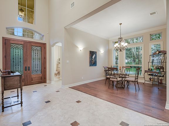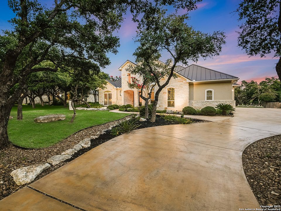 Local Custom Home builders own personal homes for sale for the very first time since built in 2006. Featuring one of the most coveted lots in River Crossing which is heavily treed and NOT one of the main arterials; level homesite and the orientation gives afternoon shade to be enjoyed from the covered back porch or balcony. Elegant stone, stucco and a metal roof adorn this beauty with a dreamy floor plan, downstairs consists of the primary suite, two oversized bedrooms, a full bath, study, powder room, formal dining room, a great room, kitchen and breakfast. Upstairs has a large game room, wet bar, bedroom, full bath, climate controlled storage(14X16) and balcony with a view! Plenty of potential in your oversized garage of 844 sq. ft. which is 24ft deep with 18ft wide & 8ft. tall doors. Soaring ceilings, wood, tile and carpet and windows dressed in plantation shutters, granite in the kitchen and all bathrooms. Covered front porch 88 sq. ft., Covered back patio 372 sq. ft., Covered balcony 180 sq. ft.,Three HVAC units, Gas heat, gas cooktop, gas starter fireplace, gas grill at patio, metal roof June 2017, gutters August 2022, tankless H20 heater August 2022. Just a few of builders' own add ons upon design and construction include extra insulation in the walls and ceilings of home and garage and Cast iron tubs in the bathrooms...high elevation lot with plenty of room for a pool or casita.