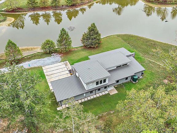 A Modern Waterfront Oasis nestled on over 6 acres of land with jaw-dropping wrap around views backed by nature and beginning with a fully stocked pond stretching across 3.76 acres. This stunning custom built home features a 8 ft. Mahogany door at its threshold beckoning you to tour this alluring property. As you step inside, the stained concrete floors shimmer in the sunlight, guiding you pass a beautiful bar. The spacious kitchen grants culinary magic with elongated countertops and a walk-in pantry that lies concealed and nestled next to the beautiful built-in refrigerator. The fireplace features a floor-to-ceiling design, imported from Turkey. The exposed bricks carry you throughout the home to create a contemporary feel, while the custom cabinetry with soft-close technology provides ample storage space that is both functional and stylish. Downstairs you will find two spacious guest rooms and a glistening bathroom shrouded with sleek designs. The first floor primary suite serves as a blissful escape encompassing a floating bed, a spa-like ensuite featuring a glassed shower and gorgeous pendant lighting. The primary walk-in closet also serves as a official storm shelter. The upstairs was completed in 2023 to consist of a substantial guest room, full bathroom and bonus room/den. Residents in the area enjoy McClain Resort & Lodge - popular for its delicious meals, mouth-watering market place, and fun wildlife safari drive-through. You will also enjoy shopping and dining in Dogwood and the A-rated schools. Welcome Home!