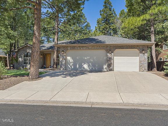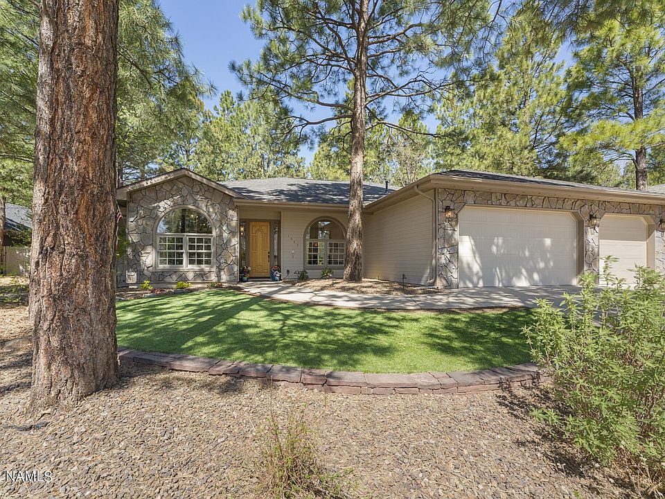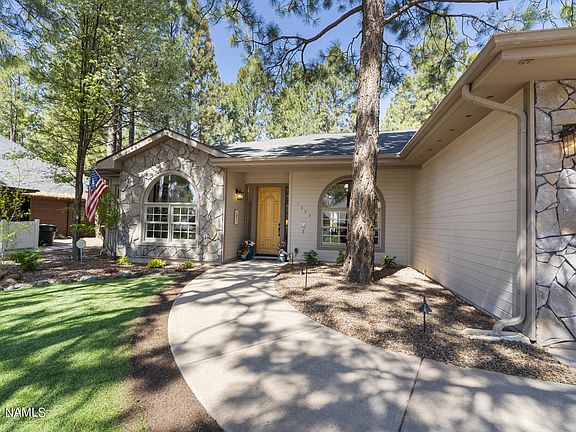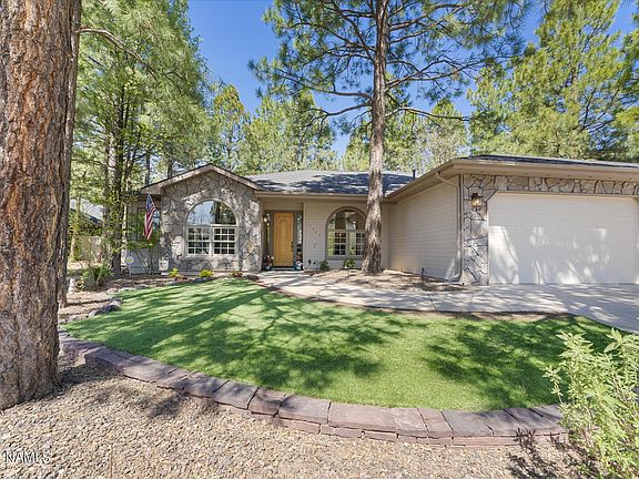 Designed for entertaining, this single level split floor plan is located in one of Flagstaff's most popular neighborhoods. Eat in Kitchen has huge breakfast bar, granite countertops, a walk-in pantry, and is the center of the house. Range is electric but plumbed for gas. Home features 3 guest rooms in addition to primary bedroom and an office. Large formal living room, dining room, and family room border the kitchen giving the home an easy flow for entertaining. The fully fenced flat backyard has a covered paver patio, ideal for outdoor living. It also has a putting green! Roof replaced in 2021. This Amberwood beauty won't last long so book your private showing today.
