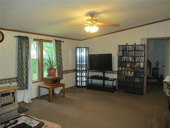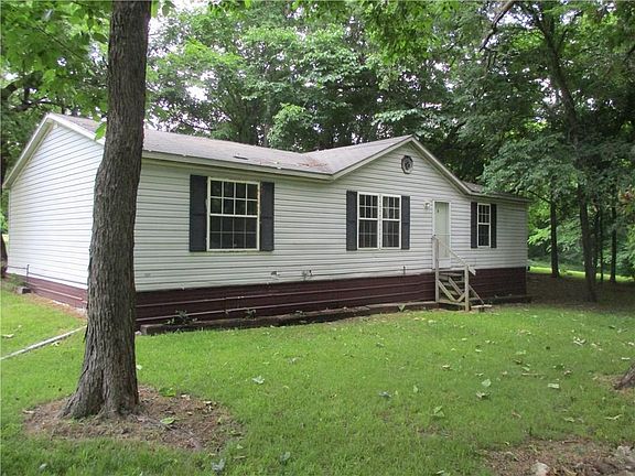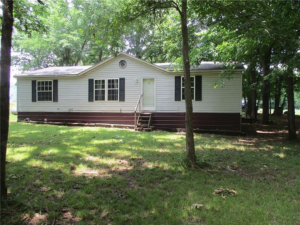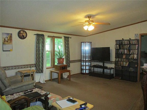 Tranquil setting off paved road! 3 bedroom, 2 bath doublewide with cathedral ceilings, open living and dining area, pantry, built in hutch, large master bath with walk in shower and laundry area, walk in closets in all the bedrooms. All appliances covey, two propane back up wall heaters. Mature trees and wet weather creek on back side of home.