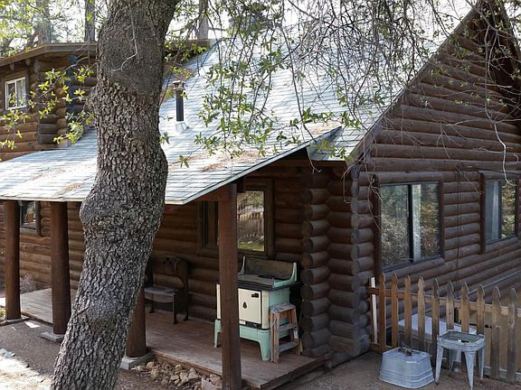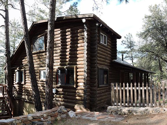 Harken back to a simpler time in this quintessential Prescott log cabin in the pines in Mountain Club. Imagine this 2 bedroom 2 bath authentic log cabin as your weekend getaway from the heat and stress of Phoenix life or as a full time home wherein simplicity reigns! Rich in natural materials and charm, this cabin is built with hefty log construction, hardwood floors, knotty pine plank walls and ceilings, and impressive floor to ceiling rock faced wood burning fireplace. This cabin offers main level living with an open concept and abundant windows to capture the forest, mountain and Thumb Butte views. One enters from the wood plank covered entry porch into a Great Room which offers dining and living space adjacent to an efficient kitchen with gas range and frig. A pellet stove and