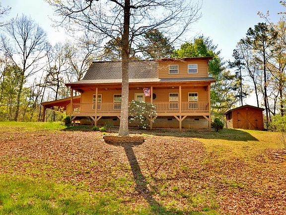 This home is one of the neatest, sweetest homes on the market. Two levels w/ a bedroom and bath on each level. Separate utility room downstairs & a loft area that can be used for whatever you want to make it. French doors on the upstairs oversized master bedroom, walk in closet, bath. Downstairs the dining room area and living room share a stone fireplace with gas logs that opens into both. Front covered porch back covered porch w/ an additional deck area open for grilling or sunshine! Easy access off a paved road, carport, convenient to town, nice yard, storage building. Heart pine wood floor. & carpet,
