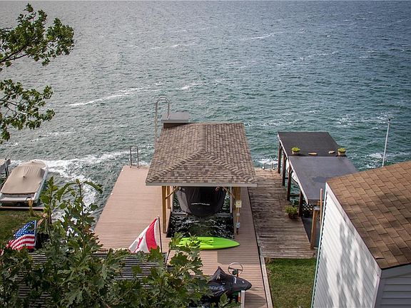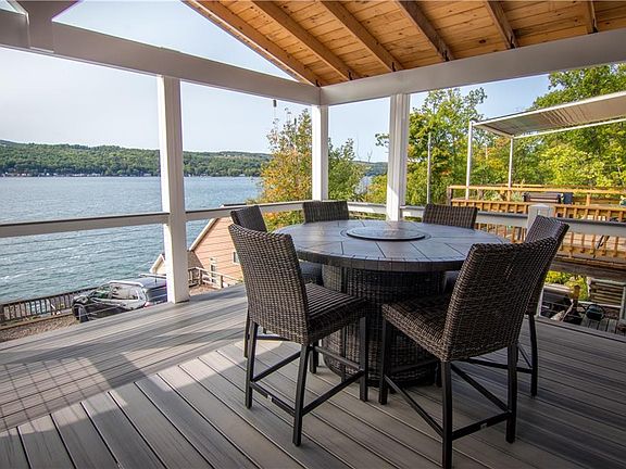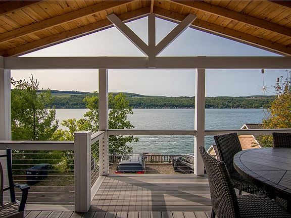 EXCEPTIONAL *KEUKA LAKE* TURN KEY that has been completely & tastefully upgraded inside and out from the floors to the fixtures to the new spacious covered deck to the unbelievable permanent covered dock built to accommodate a 24 ft boat & has a fun diving perch. Inside has an open floor plan with lots of natural light and the lake facing covered deck is spacious enough for dining and seating . low maintenance so you can enjoy more lake time. New flooring, new butcher block counters and backsplash in kitchen that fab deck is all brand new Trex was used on dock and new deck addition to house. cable composite rails were used on deck to offer a seamless view. New Paint throughout - Just Lovely! and for assistance bringing your heavy items to the dock there is a small tram that will also hold a person. at the lakeside you will find a deck and large storage building for fridge and boat toys. Your perfect summer retreat!