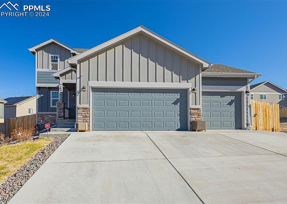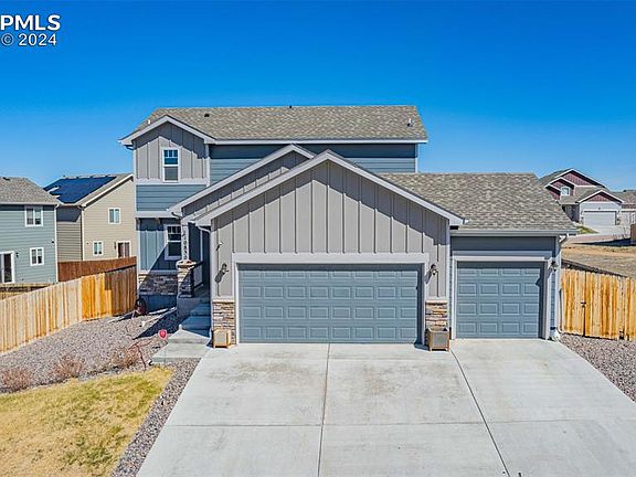 Stunning two-story home boasts 4 bedrooms and 4 bathrooms with a finished basement, nestled in the tranquil setting of Lorson Ranch. When you enter you are greeted by a tiled entryway that unfolds into a generously sized living space. The main living area seamlessly integrates with the dining space and kitchen, highlighted by custom-crafted, floating wooden shelves that add a personal touch to the decor. Carpet and beautiful hardwood flooring on main level. The kitchen has a central island, sleek espresso-toned 36 inch cabinetry, laminate countertops, ample pantry storage with two pantries, and modern recessed lighting. It comes fully equipped with top-of-the-line Whirlpool appliances, including a gas stove, dishwasher, built-in microwave, and a side by side refrigerator. The upper level of the home has three bedrooms and two bathrooms. The Primary suite is a private retreat with modern barn door, a luxurious five-piece ensuite bathroom, featuring a dual-sink vanity, separate shower, soaking tub, and a spacious walk-in closet with an organized custom shelving system. The additional bedrooms share access to a well-appointed full bathroom. The finished basement is an entertainer's delight, featuring an accented wall with oak barrel wood as you head downstairs and stained concrete flooring in the recreational area, complete with a wet bar for hosting. This level also includes a fourth bedroom with an ensuite bathroom, ideal for guests. The three-car garage includes an epoxy-coated floor. The backyard is an oasis of relaxation, featuring a deck constructed with Thompson water-sealed wood, providing a serene outdoor space complete with roll-down shades for privacy. A storage shed in the backyard offers additional space for gardening tools and outdoor equipment. New sod in front yard- Conveniently located near schools, parks, military bases, and just minutes away from the Colorado Springs airport, making this home a perfect blend of comfort, security, and convenience.